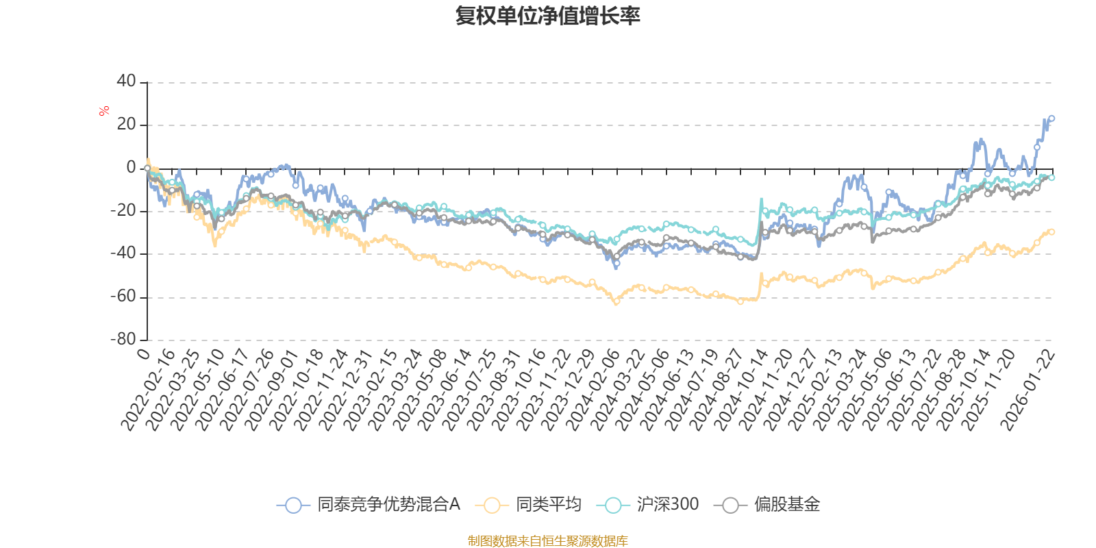 截至1月22日,同泰竞争优势混合A近三个月复权单位净值增长率为21.87%,位于同类可比基金12/100;近半年复权单位净值增长率为47.19%,位于同类可比基金17/100;近一年复权单位净值增长率为60.18%,位于同类可比基金23/92;近三年复权单位净值增长率为47.24%,位于同类可比基金7/68。