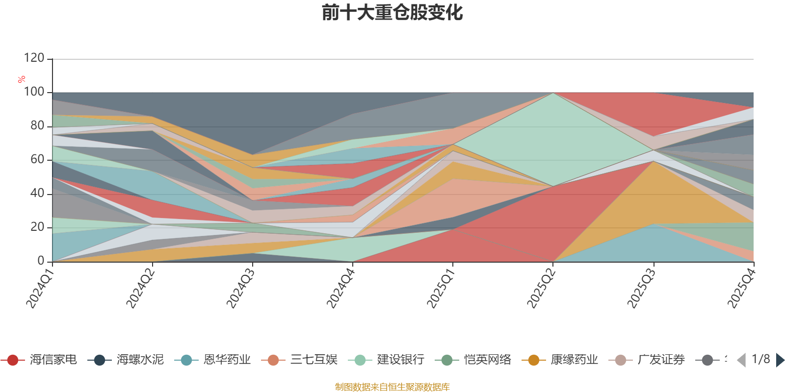 该基金持股集中度较高,近2年前十大重仓股集中度长期超过60%。截至2025年四季度末,基金十大重仓股分别是恺英网络、国泰海通、恒立液压、海兴电力、华泰证券、中恒电气、神州泰岳、广发证券、吉比特、三七互娱。