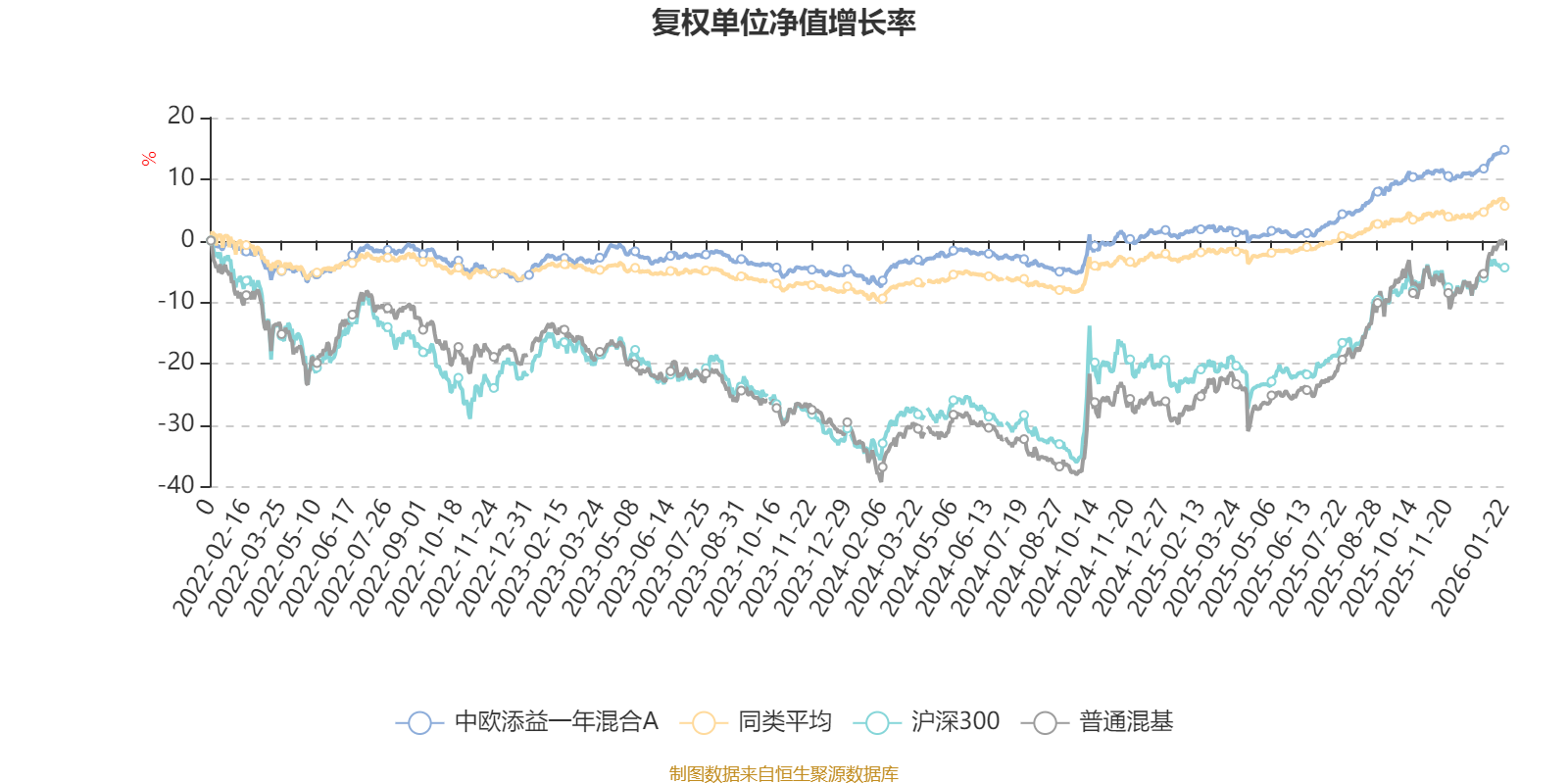 截至1月22日,中欧添益一年混合A近三个月复权单位净值增长率为4.08%,位于同类可比基金115/629;近半年复权单位净值增长率为10.03%,位于同类可比基金73/629;近一年复权单位净值增长率为13.18%,位于同类可比基金114/626;近三年复权单位净值增长率为17.52%,位于同类可比基金129/564。