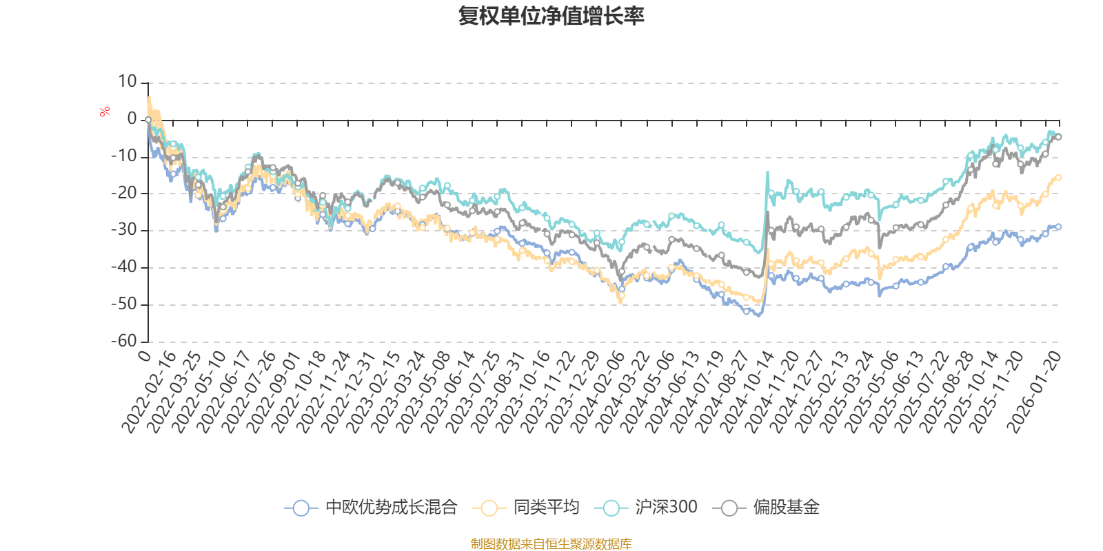 截至1月20日,中欧优势成长混合近三个月复权单位净值增长率为6.12%,位于同类可比基金435/621;近半年复权单位净值增长率为19.54%,位于同类可比基金409/621;近一年复权单位净值增长率为29.30%,位于同类可比基金440/613;近三年复权单位净值增长率为-5.90%,位于同类可比基金452/535。