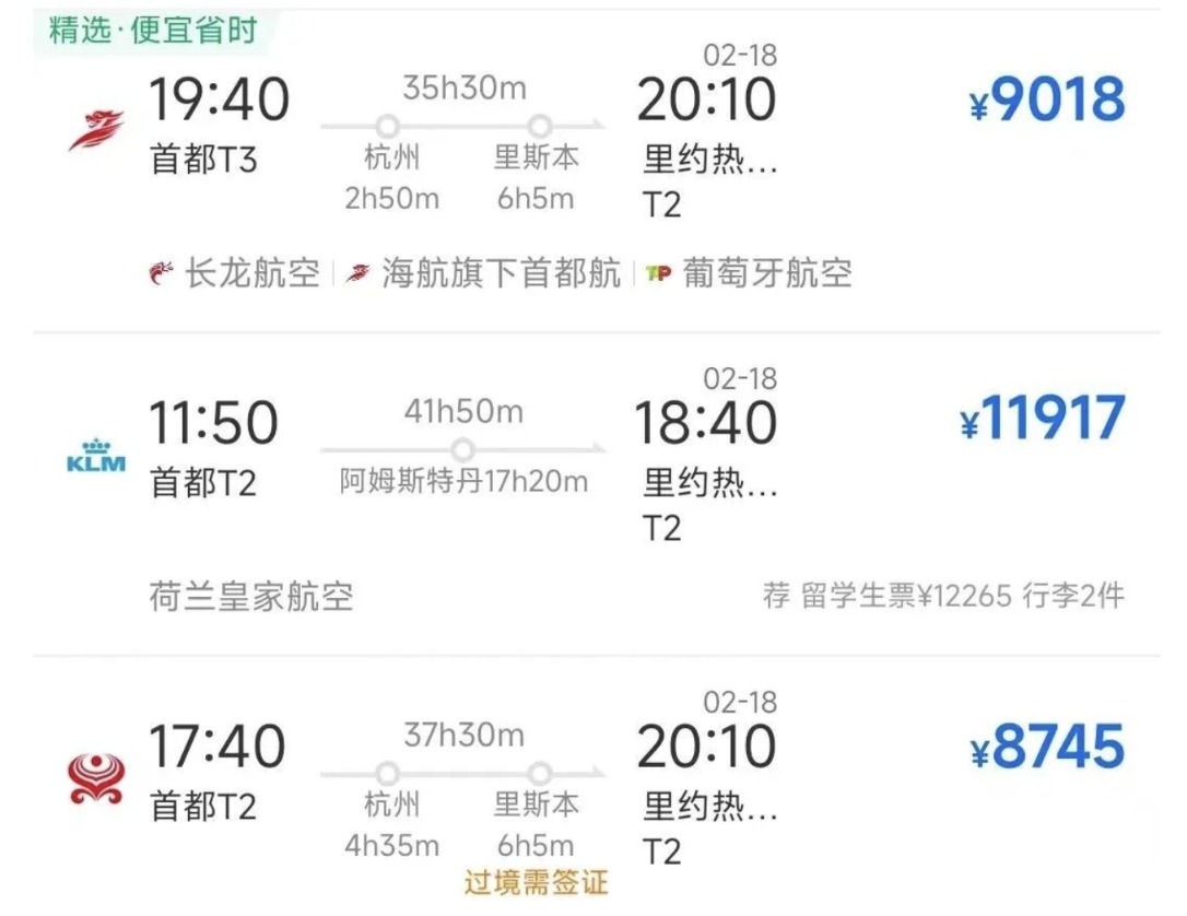 所以国航的北京-马德里-圣保罗航线,已经是目前最快抵达巴西的方式了,但一周只有三班。乘坐其他航线去巴西,中转次数更多,耗时更长。比如从北京到迪拜、法兰克福、巴黎、罗马、阿姆斯特丹、伦敦、纽约等地转机再飞往巴西,普遍花费的时间在30小时以上,有的甚至超过40小时。