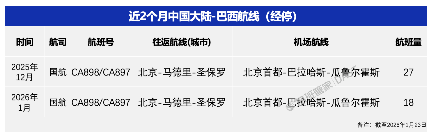 虽然有很多网友热烈的讨论免签后要去巴西玩,但目前去巴西的航班并无直航。根据航班管家DAST数据,中国大陆-巴西航线于2020年4月断航,2024年4月恢复,目前中国大陆-巴西暂无直飞航班,通航航线主要为由中国国际航空公司执飞的北京--马德里--圣保罗航线,2025年12月执飞航班量27班次。