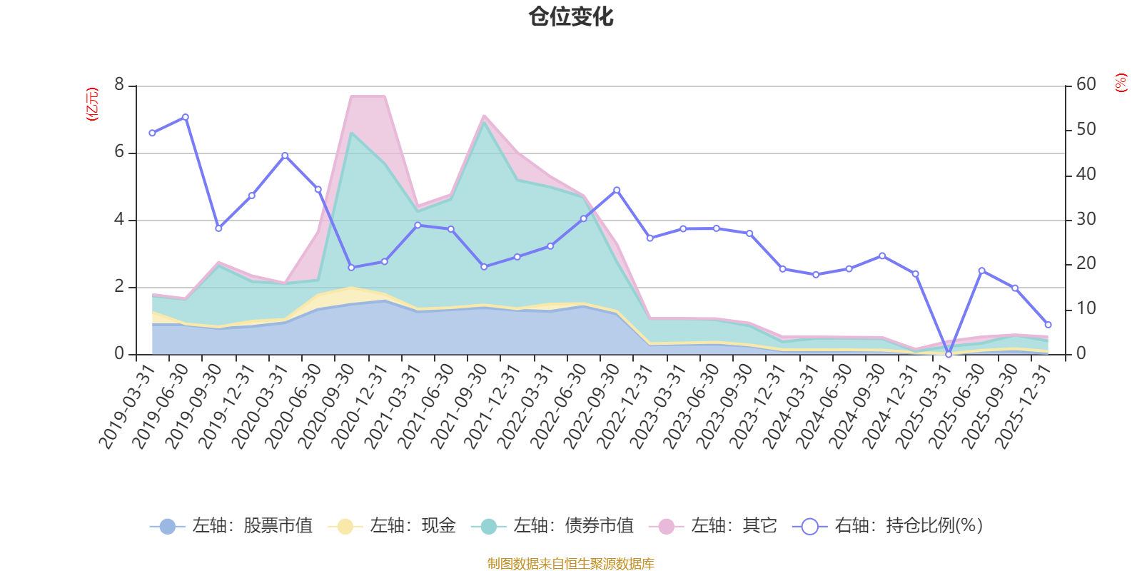 据定期报告数据统计,近三年平均股票仓位为18.27%,同类平均为72.57%。2019年上半年末基金达到52.99%的最高仓位,2025年末最低,为6.62%。