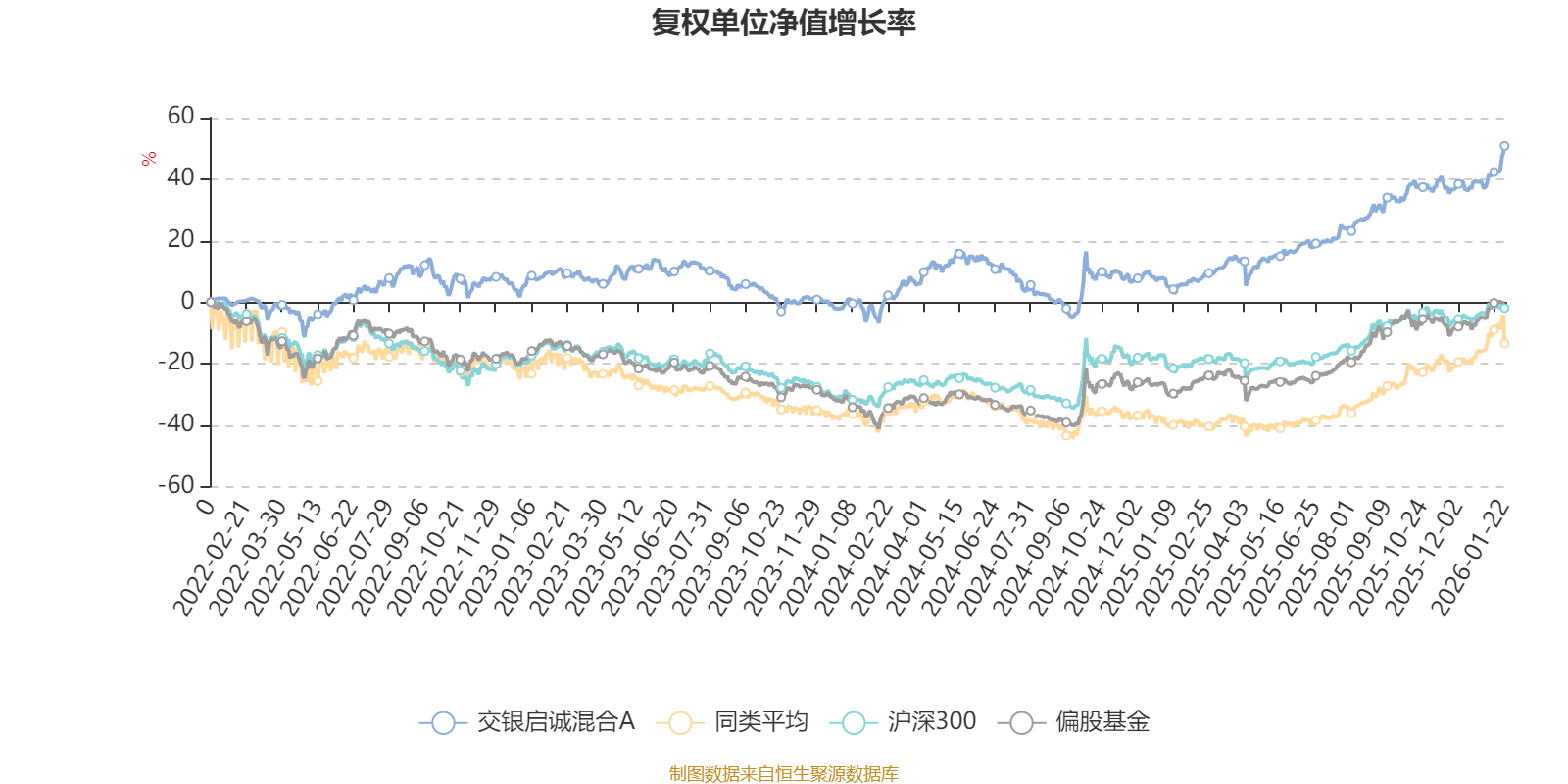 截至1月22日,交银启诚混合A近三个月复权单位净值增长率为9.73%,位于同类可比基金39/49;近半年复权单位净值增长率为20.48%,位于同类可比基金40/49;近一年复权单位净值增长率为42.59%,位于同类可比基金30/46;近三年复权单位净值增长率为37.89%,位于同类可比基金16/30。