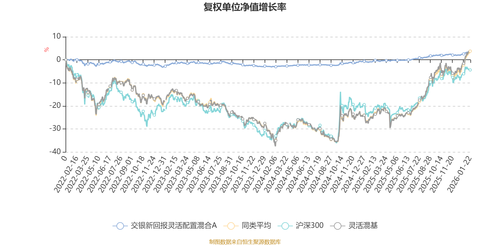 截至1月22日,交银新回报灵活配置混合A近三个月复权单位净值增长率为1.87%,位于同类可比基金1048/1286;近半年复权单位净值增长率为2.87%,位于同类可比基金1139/1286;近一年复权单位净值增长率为4.70%,位于同类可比基金1209/1286;近三年复权单位净值增长率为5.55%,位于同类可比基金909/1286。