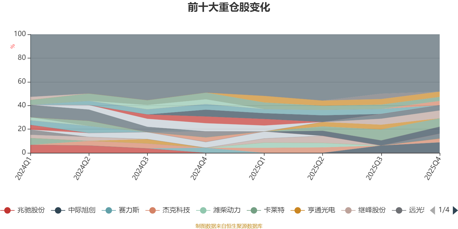截至2025年四季度末,基金十大重仓股分别是中际旭创、新易盛、寒武纪、隆鑫通用、思瑞浦、赛轮轮胎、涛涛车业、东山精密、恒铭达、杰克科技。