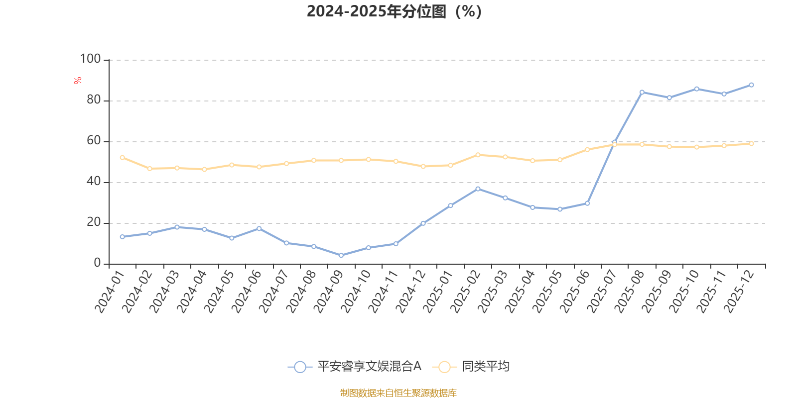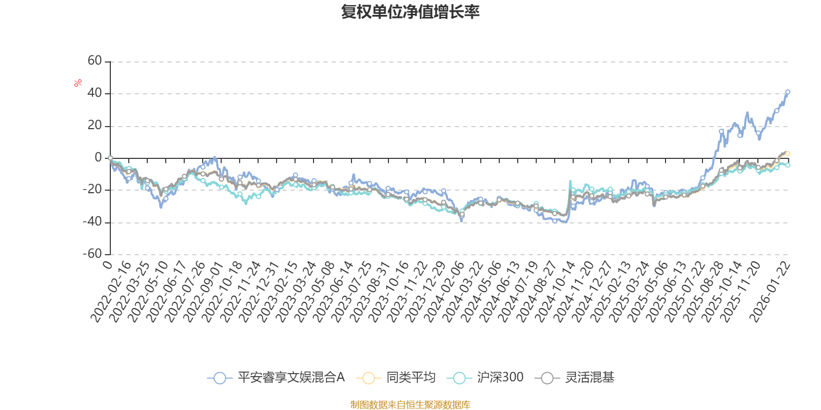 截至1月22日,平安睿享文娱混合A近三个月复权单位净值增长率为18.76%,位于同类可比基金145/1286;近半年复权单位净值增长率为60.98%,位于同类可比基金82/1286;近一年复权单位净值增长率为75.08%,位于同类可比基金89/1286;近三年复权单位净值增长率为66.25%,位于同类可比基金98/1286。