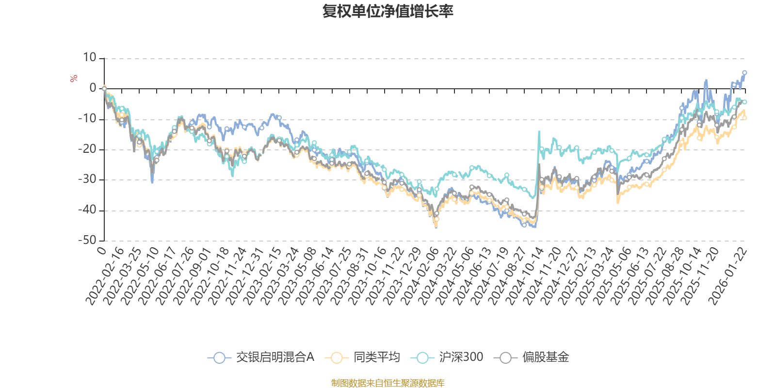 截至1月22日,交银启明混合A近三个月复权单位净值增长率为11.38%,位于同类可比基金59/185;近半年复权单位净值增长率为26.86%,位于同类可比基金69/185;近一年复权单位净值增长率为52.18%,位于同类可比基金51/183;近三年复权单位净值增长率为15.97%,位于同类可比基金96/176。