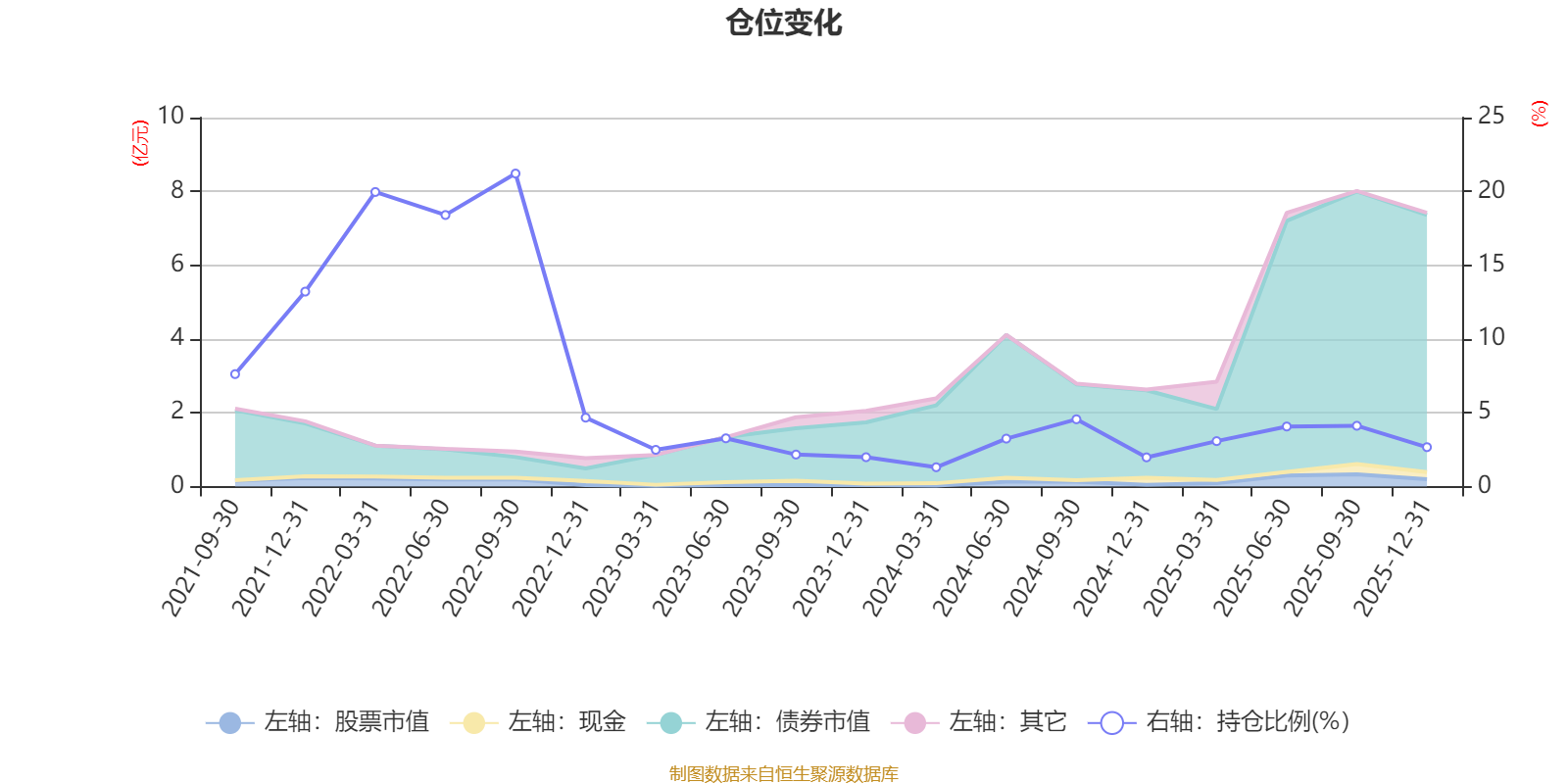 据定期报告数据统计,近三年平均股票仓位为2.91%,同类平均为19.2%。2022年三季度末基金达到21.21%的最高仓位,2024年一季度末最低,为1.31%。