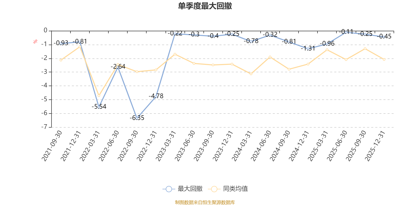 截至1月21日,基金近三年最大回撤为1.31%,同类可比基金排名5/526。单季度最大回撤出现在2022年三季度,为6.35%。