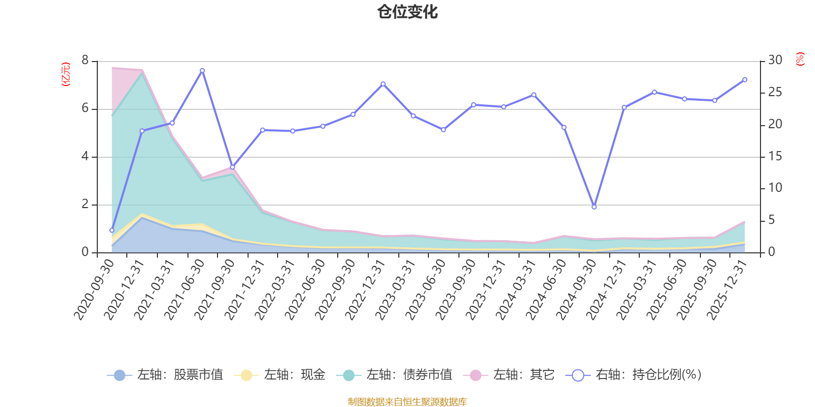 据定期报告数据统计,近三年平均股票仓位为21.75%,同类平均为19.2%。2021年上半年末基金达到28.52%的最高仓位,2020年三季度末最低,为3.5%。