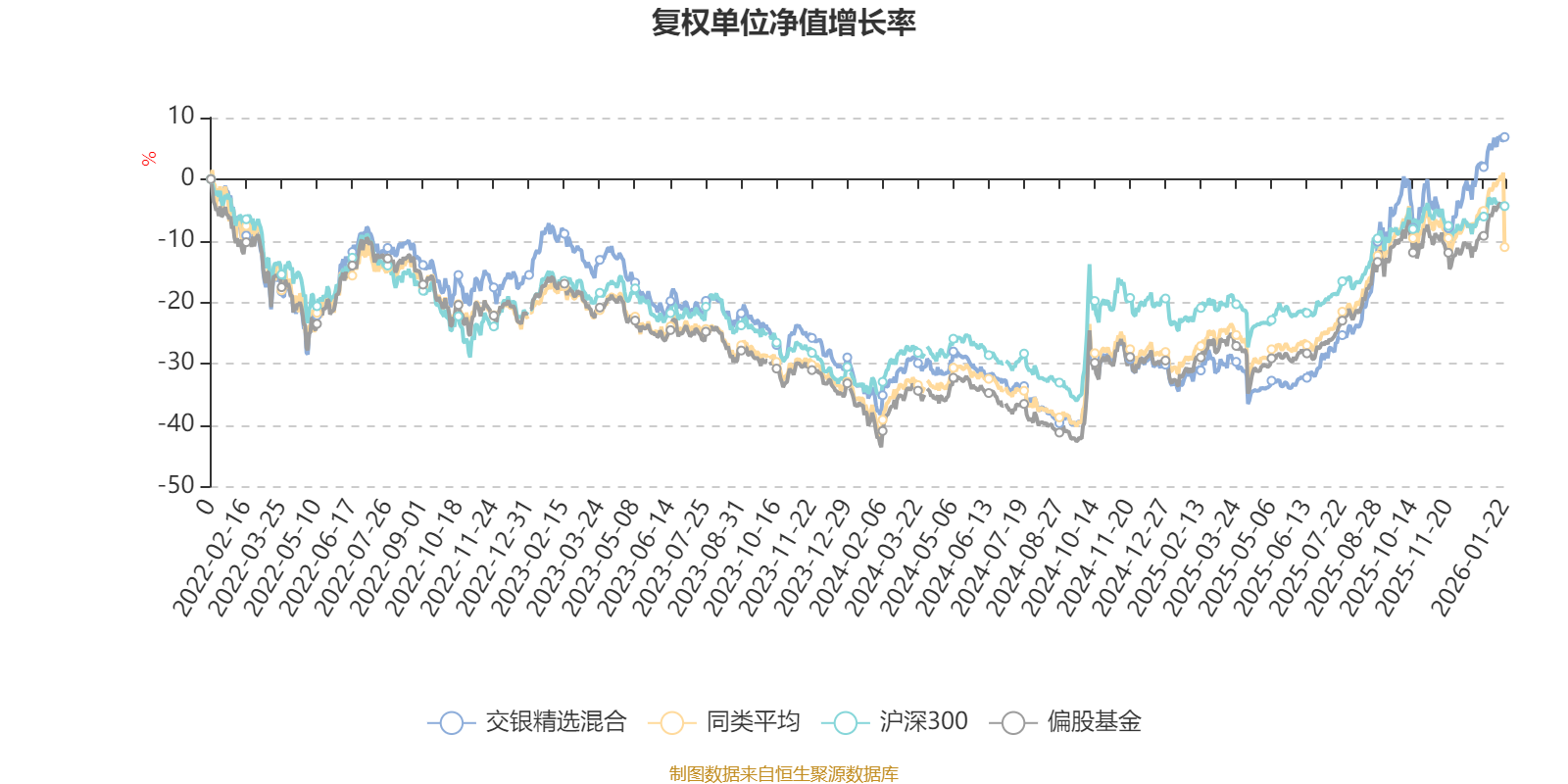 截至1月22日,交银精选混合近三个月复权单位净值增长率为12.50%,位于同类可比基金34/130;近半年复权单位净值增长率为43.19%,位于同类可比基金19/130;近一年复权单位净值增长率为55.93%,位于同类可比基金28/130;近三年复权单位净值增长率为16.18%,位于同类可比基金68/125。