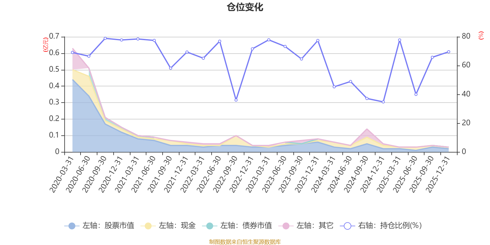 据定期报告数据统计,近三年平均股票仓位为59.37%,同类平均为72.57%。2020年三季度末基金达到78.89%的最高仓位,2024年末最低,为34.79%。
