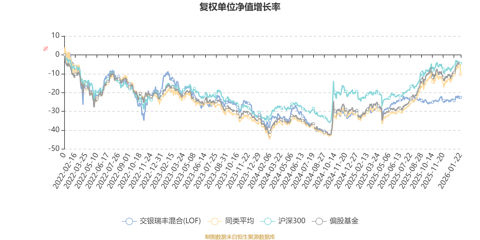截至1月22日,交银瑞丰混合(LOF)近三个月复权单位净值增长率为2.68%,位于同类可比基金229/265;近半年复权单位净值增长率为1.53%,位于同类可比基金259/265;近一年复权单位净值增长率为14.26%,位于同类可比基金252/265;近三年复权单位净值增长率为-14.53%,位于同类可比基金240/256。