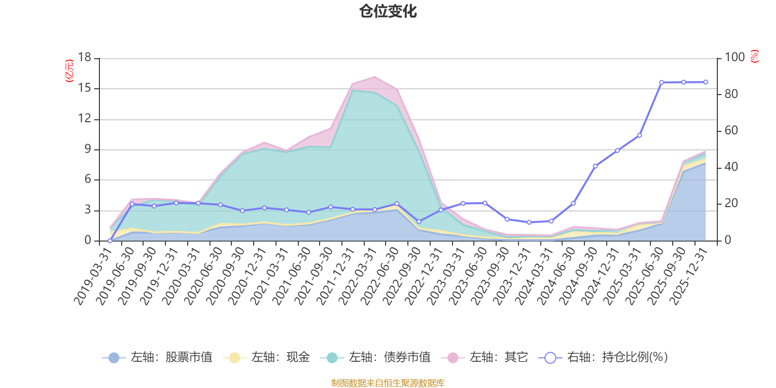 据定期报告数据统计,近三年平均股票仓位为41.92%,同类平均为72.57%。2025年末基金达到86.95%的最高仓位,2023年末最低,为10.11%。