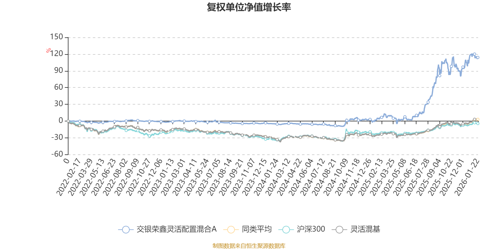 截至1月22日,交银荣鑫灵活配置混合A近三个月复权单位净值增长率为7.96%,位于同类可比基金676/1286;近半年复权单位净值增长率为64.26%,位于同类可比基金61/1286;近一年复权单位净值增长率为103.31%,位于同类可比基金14/1286;近三年复权单位净值增长率为113.66%,位于同类可比基金18/1286。