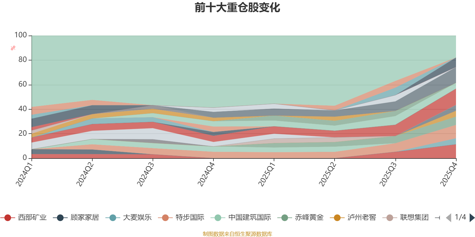 截至2025年四季度末,基金十大重仓股分别是天山铝业、同程旅行、西部矿业、特步国际、云铝股份、赤峰黄金、大麦娱乐、泸州老窖、宝钢股份、山西汾酒。