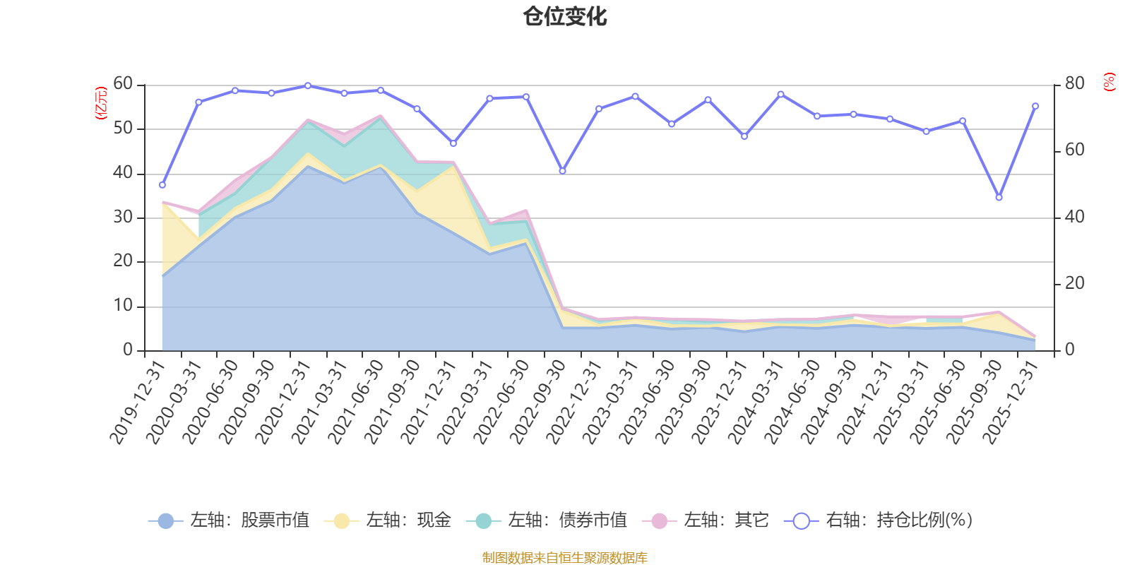 据定期报告数据统计,近三年平均股票仓位为69%,同类平均为72.57%。2020年末基金达到79.73%的最高仓位,2025年三季度末最低,为46.11%。