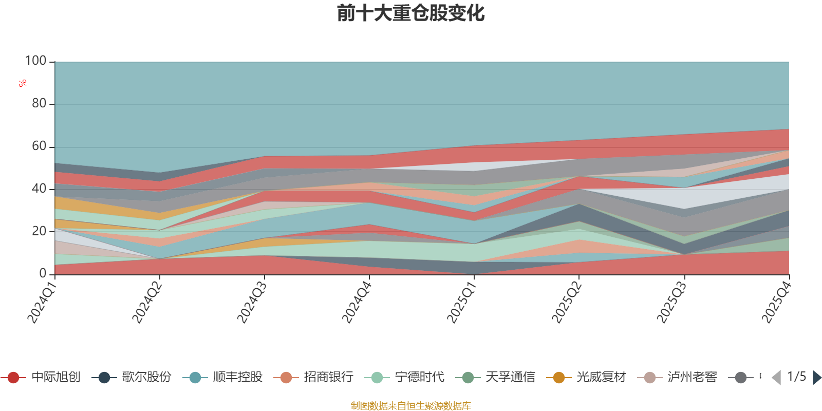 截至2025年四季度末,基金十大重仓股分别是中际旭创、恺英网络、新易盛、中材科技、寒武纪、天孚通信、生益科技、立讯精密、东方电缆、多氟多。