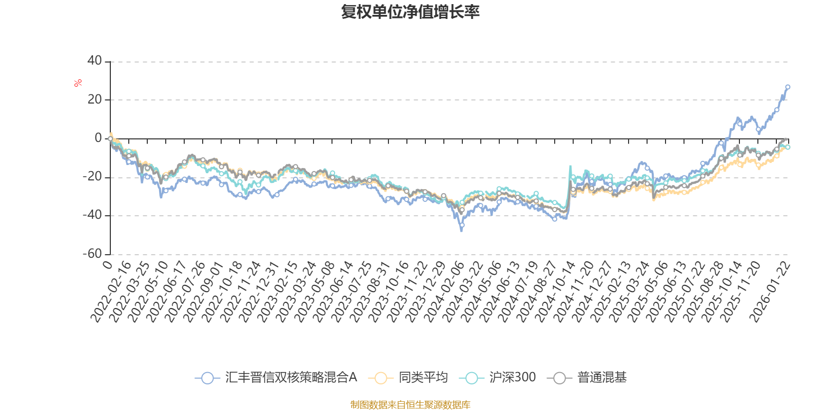 截至1月22日,汇丰晋信双核策略混合A近三个月复权单位净值增长率为19.83%,位于同类可比基金10/134;近半年复权单位净值增长率为45.41%,位于同类可比基金9/134;近一年复权单位净值增长率为64.48%,位于同类可比基金11/131;近三年复权单位净值增长率为67.74%,位于同类可比基金5/124。
