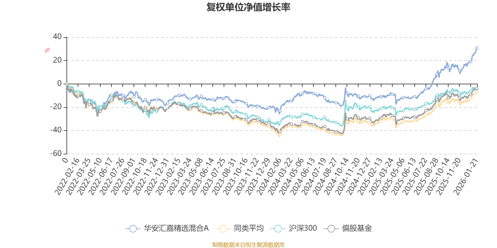 截至1月21日,华安汇嘉精选混合A近三个月复权单位净值增长率为15.63%,位于同类可比基金26/185;近半年复权单位净值增长率为37.63%,位于同类可比基金40/185;近一年复权单位净值增长率为47.84%,位于同类可比基金63/183;近三年复权单位净值增长率为48.10%,位于同类可比基金24/176。