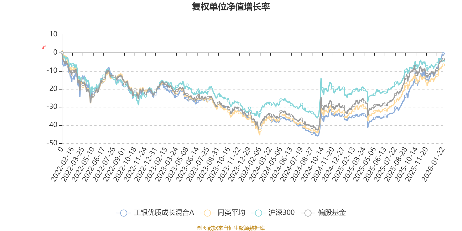 截至1月22日,工银优质成长混合A近三个月复权单位净值增长率为18.89%,位于同类可比基金15/185;近半年复权单位净值增长率为42.97%,位于同类可比基金28/185;近一年复权单位净值增长率为54.45%,位于同类可比基金41/183;近三年复权单位净值增长率为19.99%,位于同类可比基金77/176。