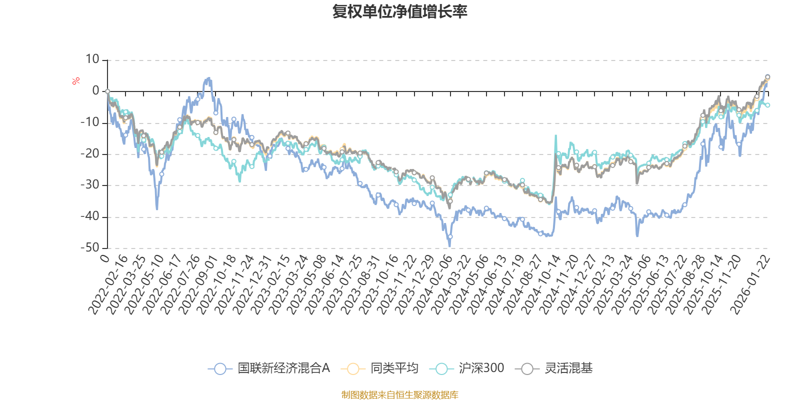 截至1月22日,国联新经济混合A近三个月复权单位净值增长率为22.39%,位于同类可比基金102/1286;近半年复权单位净值增长率为63.92%,位于同类可比基金65/1286;近一年复权单位净值增长率为66.23%,位于同类可比基金156/1286;近三年复权单位净值增长率为25.70%,位于同类可比基金449/1286。