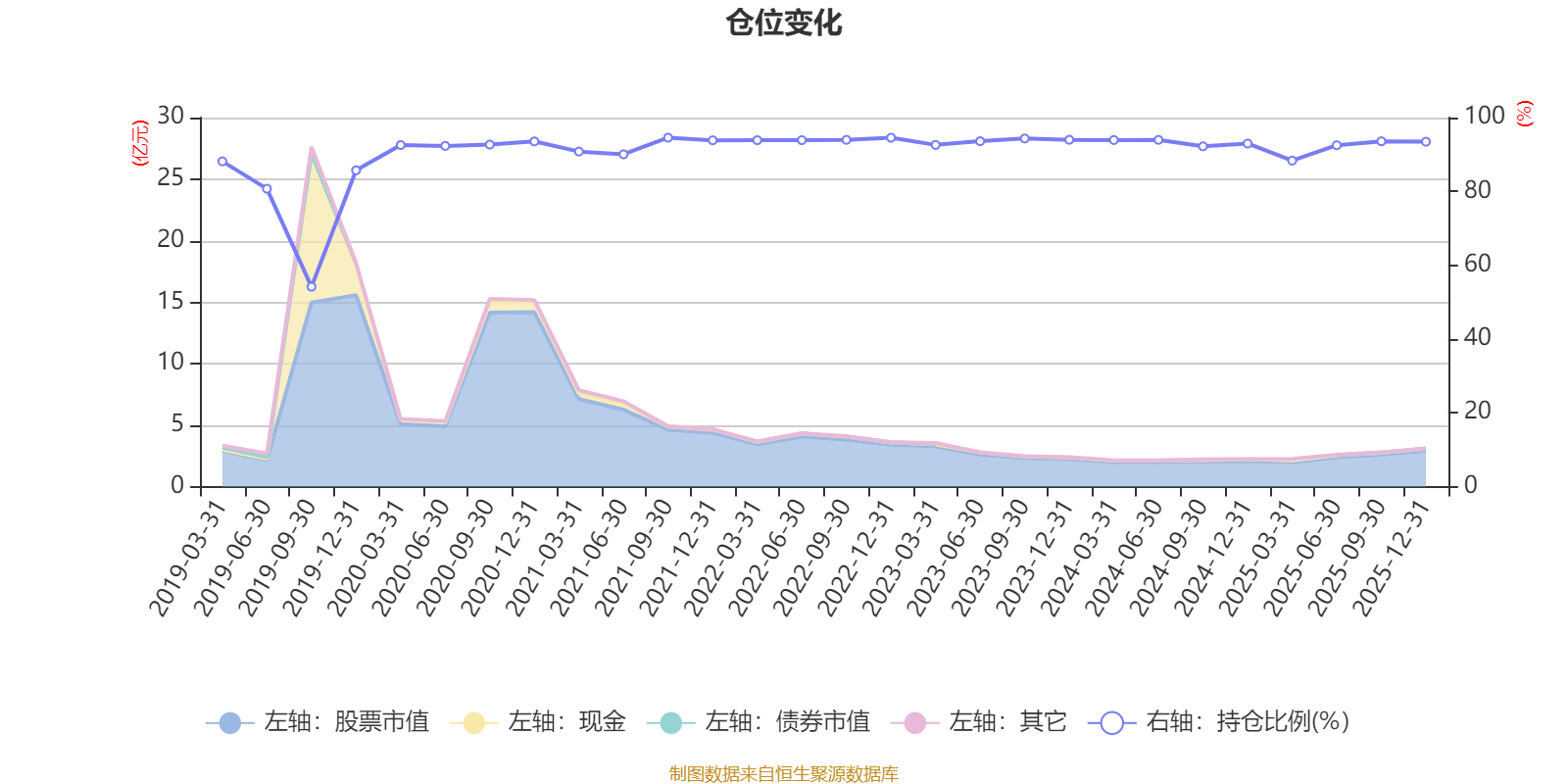 据定期报告数据统计,近三年平均股票仓位为92.96%,同类平均为72.57%。2021年三季度末基金达到94.56%的最高仓位,2019年三季度末最低,为54.16%。