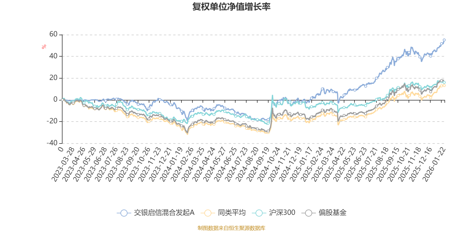 截至1月22日,交银启信混合发起A近三个月复权单位净值增长率为8.77%,位于同类可比基金363/689;近半年复权单位净值增长率为28.67%,位于同类可比基金272/689;近一年复权单位净值增长率为51.01%,位于同类可比基金187/673。
