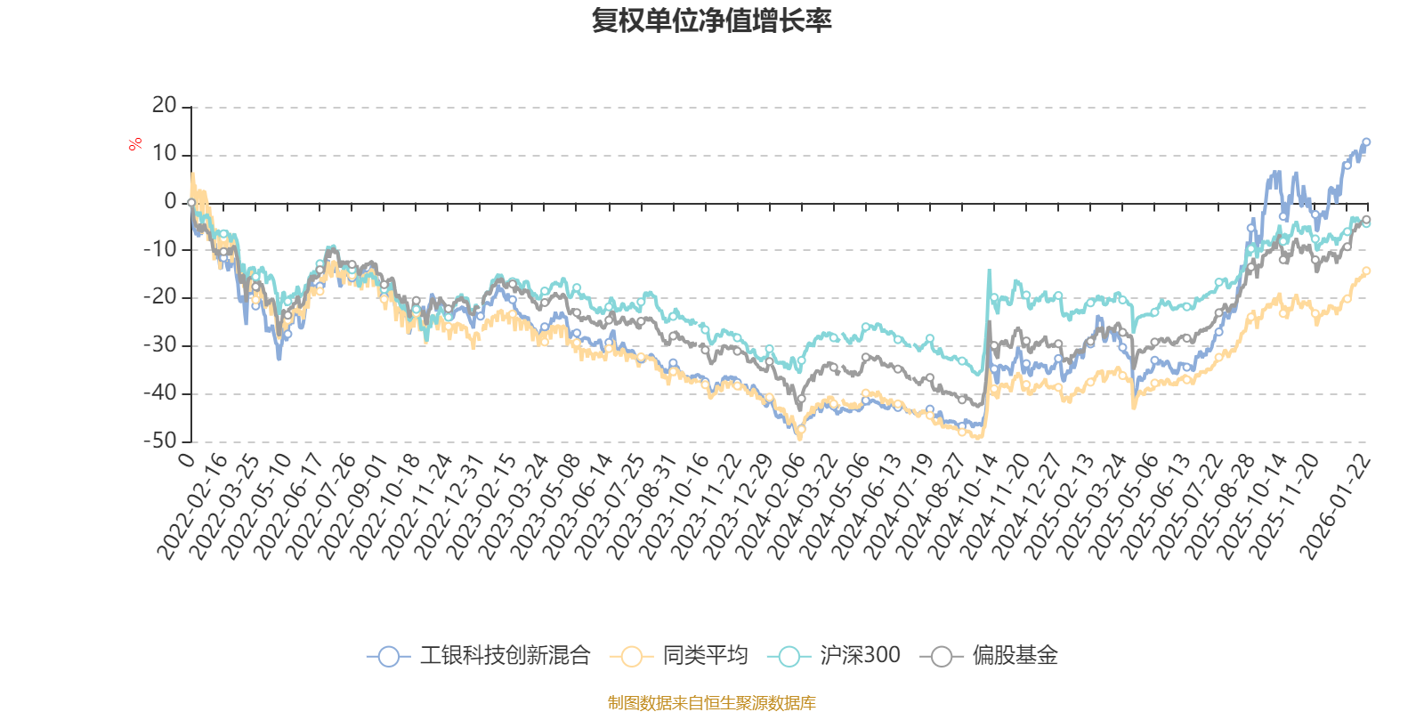 截至1月22日,工银科技创新混合近三个月复权单位净值增长率为11.01%,位于同类可比基金247/621;近半年复权单位净值增长率为54.39%,位于同类可比基金43/621;近一年复权单位净值增长率为63.36%,位于同类可比基金88/613;近三年复权单位净值增长率为38.30%,位于同类可比基金116/535。