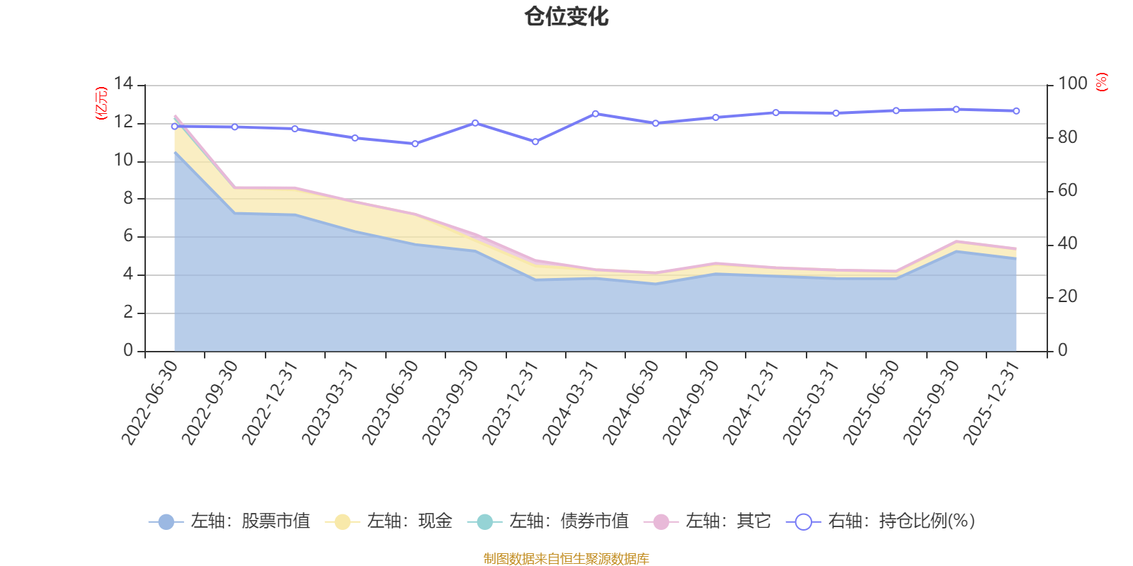 据定期报告数据统计,近三年平均股票仓位为86.28%,同类平均为85.83%。2025年三季度末基金达到90.83%的最高仓位,2023年上半年末最低,为77.91%。