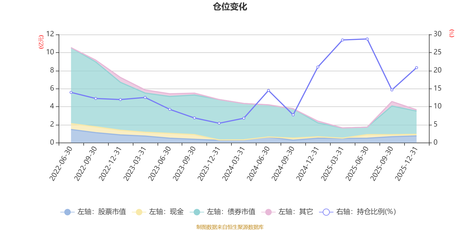 据定期报告数据统计,近三年平均股票仓位为14.73%,同类平均为19.2%。2025年上半年末基金达到28.76%的最高仓位,2023年末最低,为5.41%。