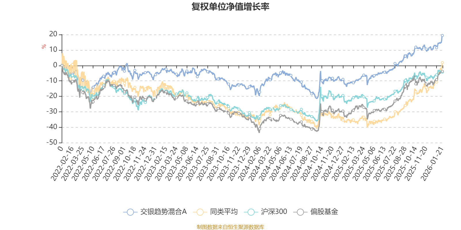 截至1月21日,交银趋势混合A近三个月复权单位净值增长率为6.99%,位于同类可比基金43/49;近半年复权单位净值增长率为19.43%,位于同类可比基金41/49;近一年复权单位净值增长率为34.73%,位于同类可比基金35/46;近三年复权单位净值增长率为23.53%,位于同类可比基金20/30。