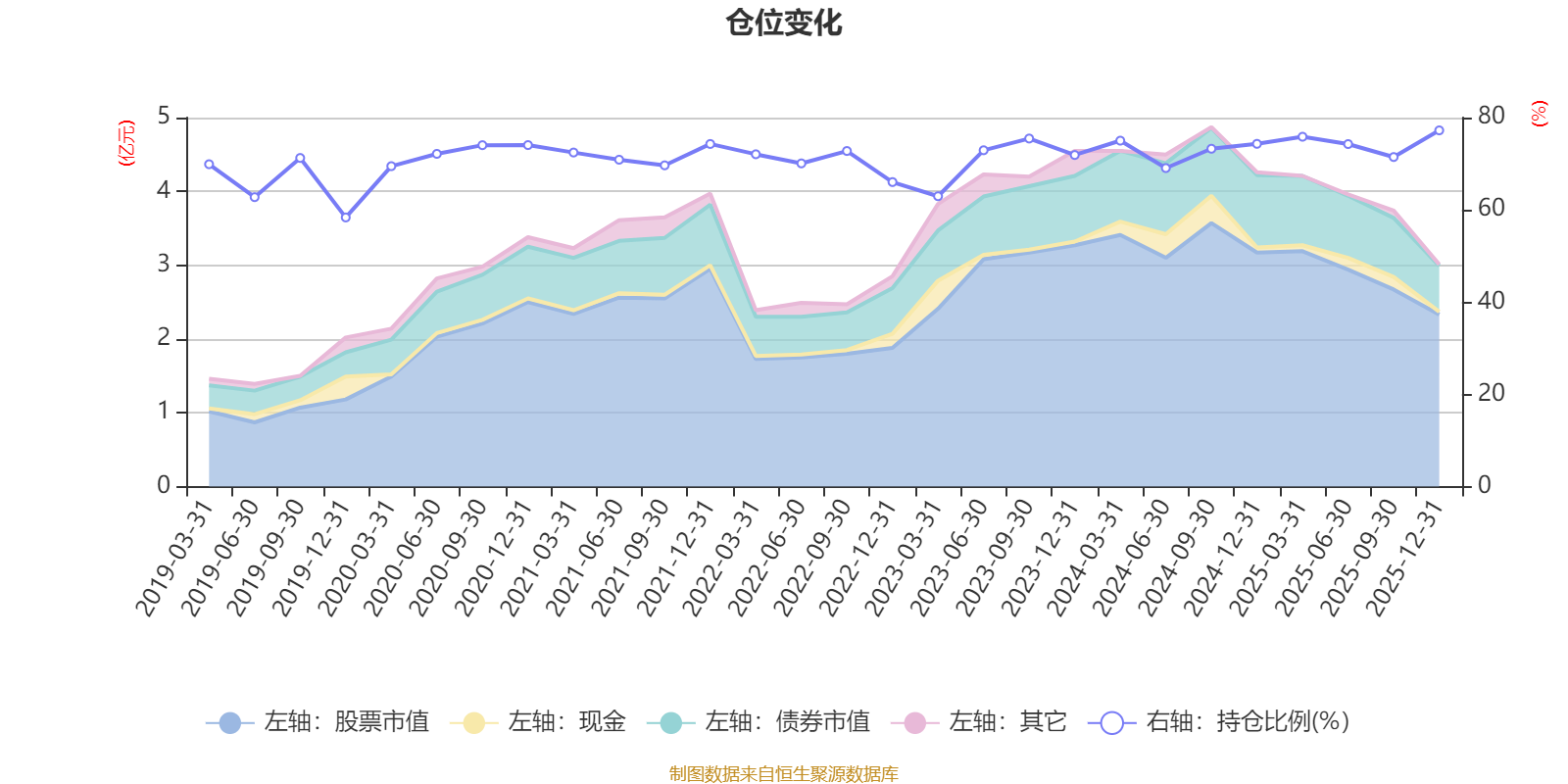 据定期报告数据统计,近三年平均股票仓位为72.8%,同类平均为72.57%。2025年末基金达到77.23%的最高仓位,2019年末最低,为58.35%。