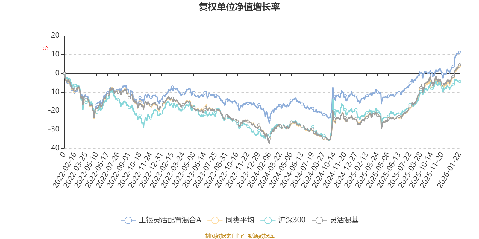 截至1月22日,工银灵活配置混合A近三个月复权单位净值增长率为12.41%,位于同类可比基金421/1286;近半年复权单位净值增长率为17.34%,位于同类可比基金751/1286;近一年复权单位净值增长率为28.73%,位于同类可比基金731/1286;近三年复权单位净值增长率为24.19%,位于同类可比基金476/1286。