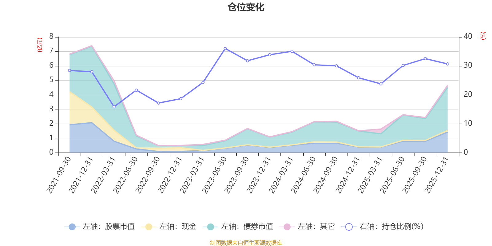据定期报告数据统计,近三年平均股票仓位为30.35%,同类平均为19.2%。2023年上半年末基金达到35.98%的最高仓位,2022年一季度末最低,为15.84%。