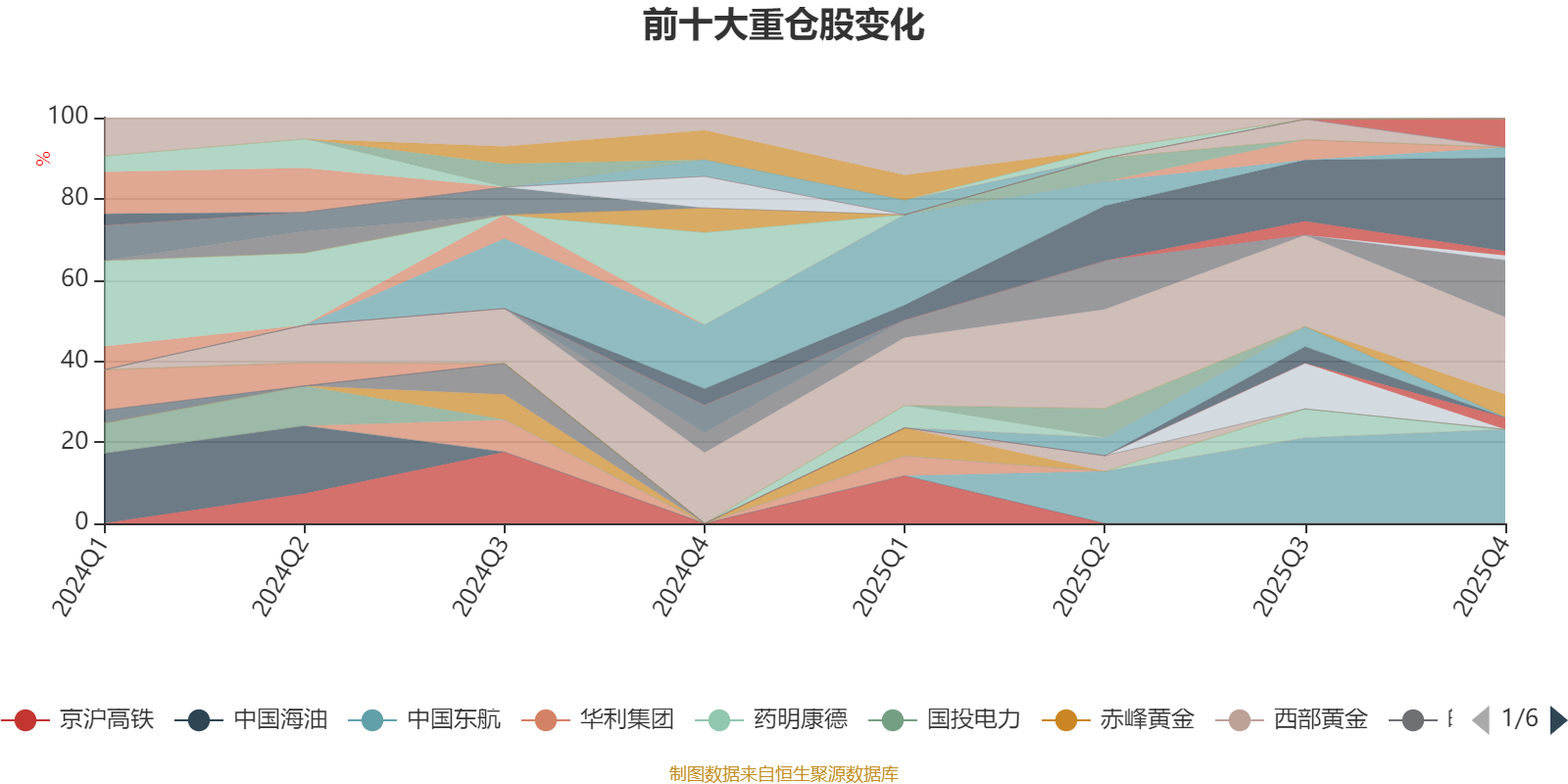 该基金持股集中度较高,近2年前十大重仓股集中度长期超过60%。截至2025年四季度末,基金十大重仓股分别是中国东航、中国国航、山东黄金、南方航空、中国电信、南方传媒、西麦食品、山金国际、安克创新、吉祥航空。