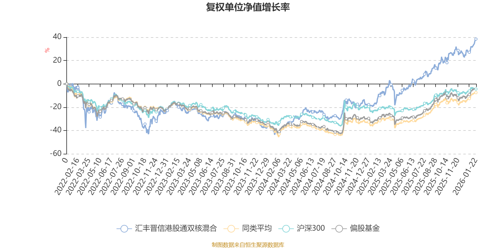 截至1月22日,汇丰晋信港股通双核混合近三个月复权单位净值增长率为9.96%,位于同类可比基金79/185;近半年复权单位净值增长率为27.72%,位于同类可比基金65/185;近一年复权单位净值增长率为66.88%,位于同类可比基金12/183;近三年复权单位净值增长率为65.52%,位于同类可比基金10/176。