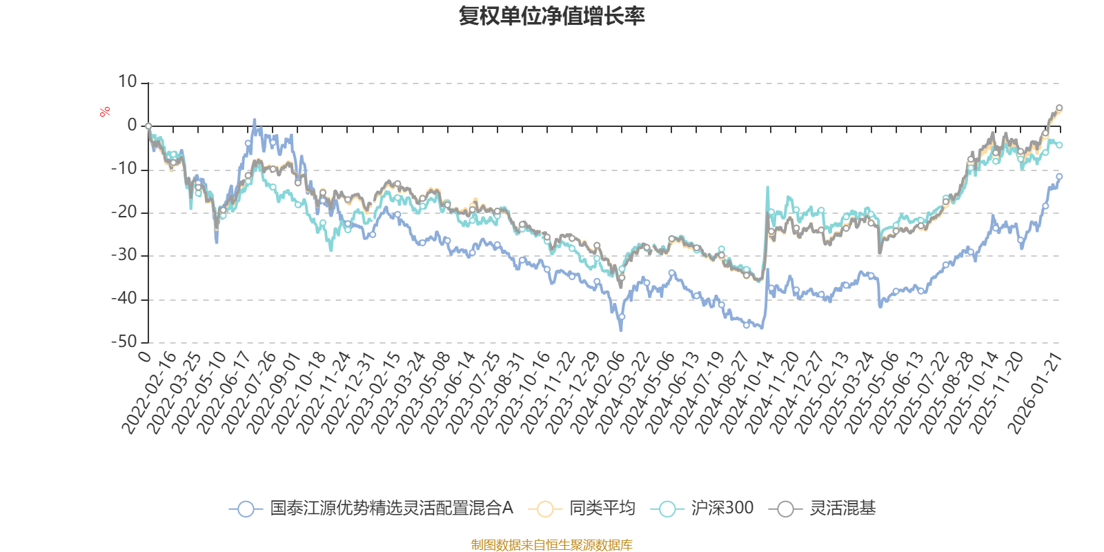 截至1月21日,国泰江源优势精选灵活配置混合A近三个月复权单位净值增长率为15.43%,位于同类可比基金229/1286;近半年复权单位净值增长率为31.02%,位于同类可比基金423/1286;近一年复权单位净值增长率为40.99%,位于同类可比基金468/1286;近三年复权单位净值增长率为8.79%,位于同类可比基金828/1286。