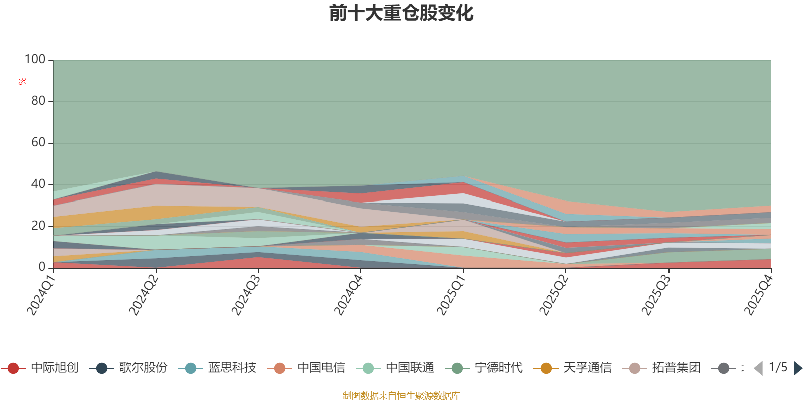 截至2025年四季度末,基金十大重仓股分别是宁德时代、中际旭创、中国平安、新易盛、紫金矿业、工商银行、农业银行、中芯国际、天赐材料、建设银行。
