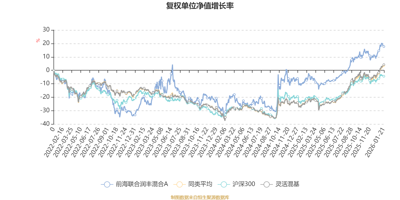 截至1月21日,前海联合润丰混合A近三个月复权单位净值增长率为5.81%,位于同类可比基金805/1286;近半年复权单位净值增长率为20.40%,位于同类可比基金679/1286;近一年复权单位净值增长率为29.25%,位于同类可比基金709/1286;近三年复权单位净值增长率为59.55%,位于同类可比基金123/1286。