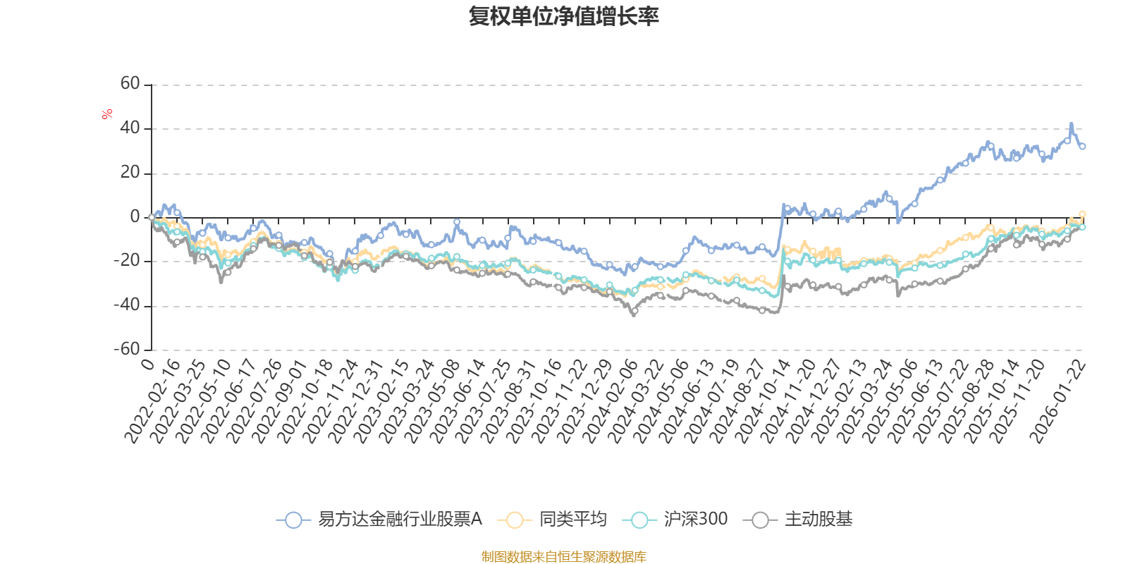 截至1月22日,易方达金融行业股票A近三个月复权单位净值增长率为3.67%,位于同类可比基金3/6;近半年复权单位净值增长率为6.17%,位于同类可比基金2/6;近一年复权单位净值增长率为32.30%,位于同类可比基金1/6;近三年复权单位净值增长率为34.90%,位于同类可比基金2/5。