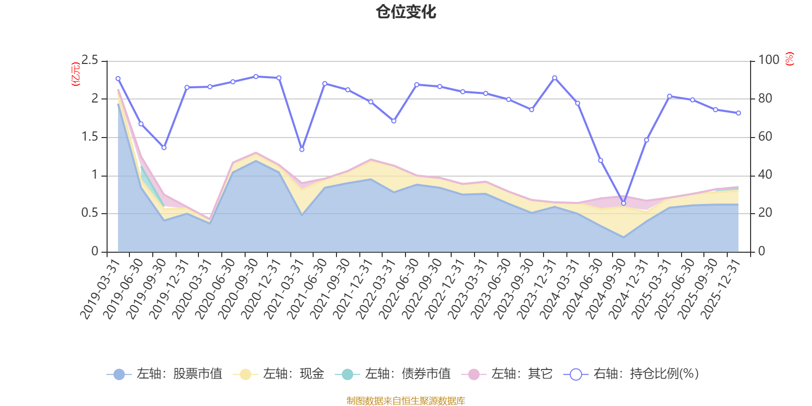 据定期报告数据统计,近三年平均股票仓位为70.56%,同类平均为72.57%。2020年三季度末基金达到91.83%的最高仓位,2024年三季度末最低,为25.48%。
