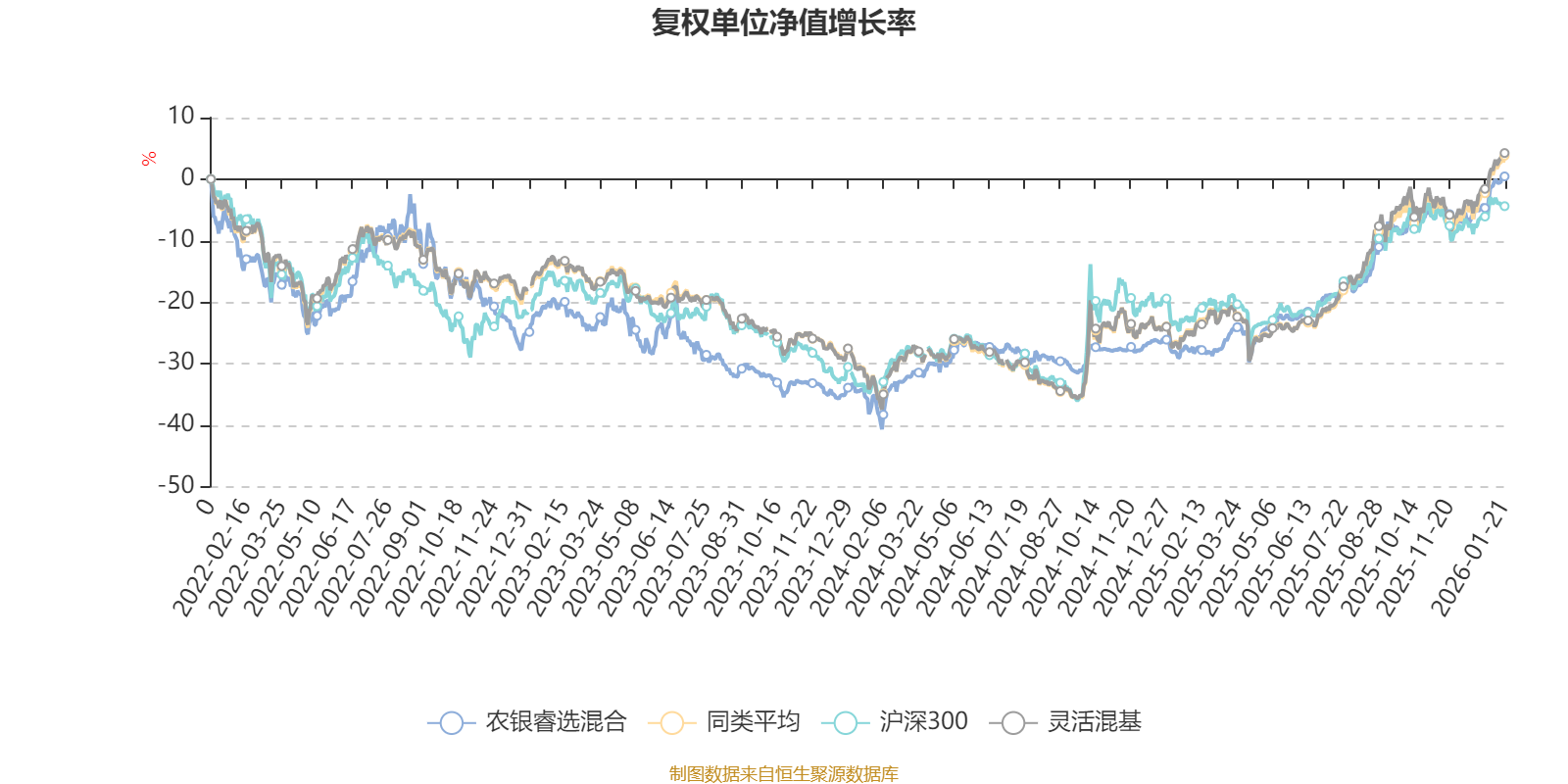 截至1月21日,农银睿选混合近三个月复权单位净值增长率为7.51%,位于同类可比基金702/1286;近半年复权单位净值增长率为22.25%,位于同类可比基金622/1286;近一年复权单位净值增长率为38.64%,位于同类可比基金524/1286;近三年复权单位净值增长率为26.29%,位于同类可比基金438/1286。