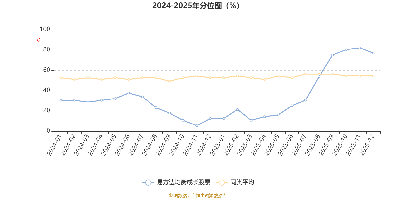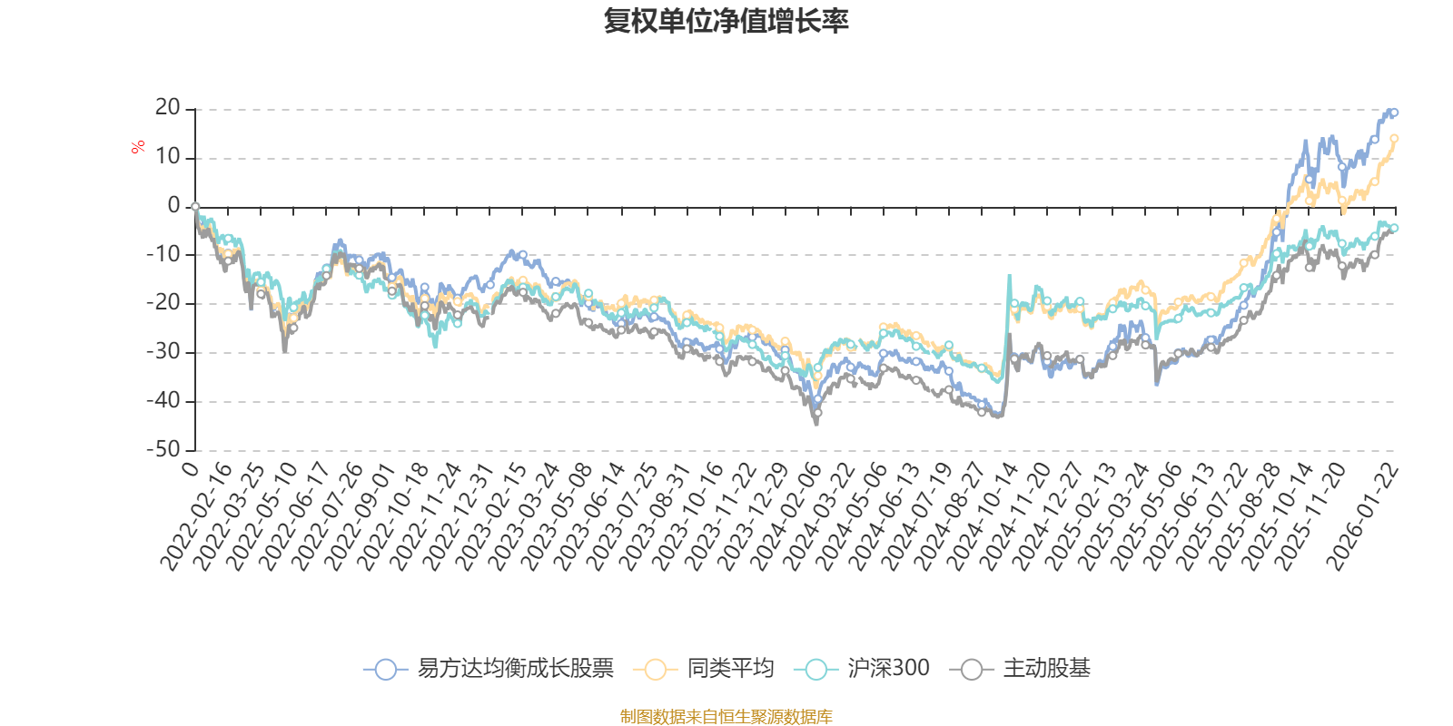 截至1月22日,易方达均衡成长股票近三个月复权单位净值增长率为11.00%,位于同类可比基金25/58;近半年复权单位净值增长率为49.52%,位于同类可比基金6/58;近一年复权单位净值增长率为74.60%,位于同类可比基金3/57;近三年复权单位净值增长率为32.96%,位于同类可比基金28/57。