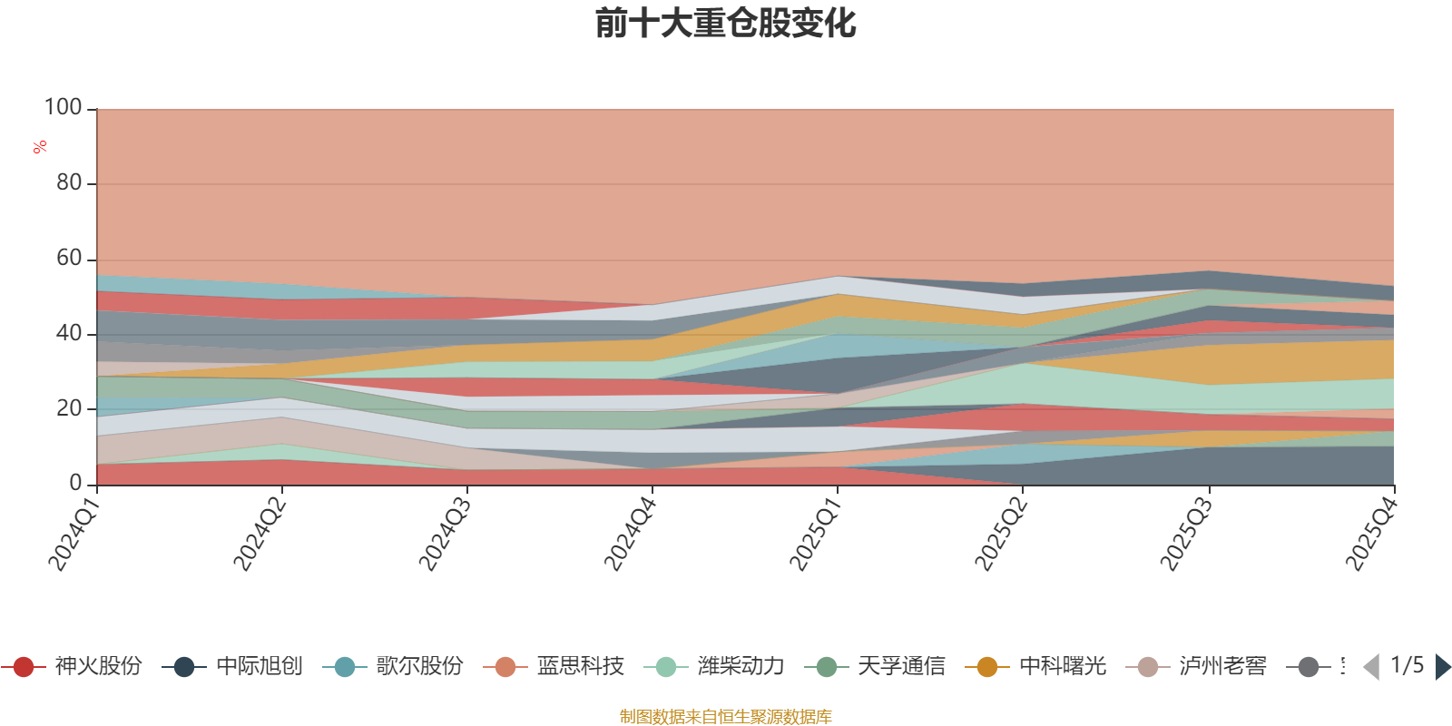 截至2025年四季度末,基金十大重仓股分别是新易盛、中际旭创、沪电股份、天孚通信、深南电路、东山精密、中芯国际、寒武纪、景旺电子、领益智造。