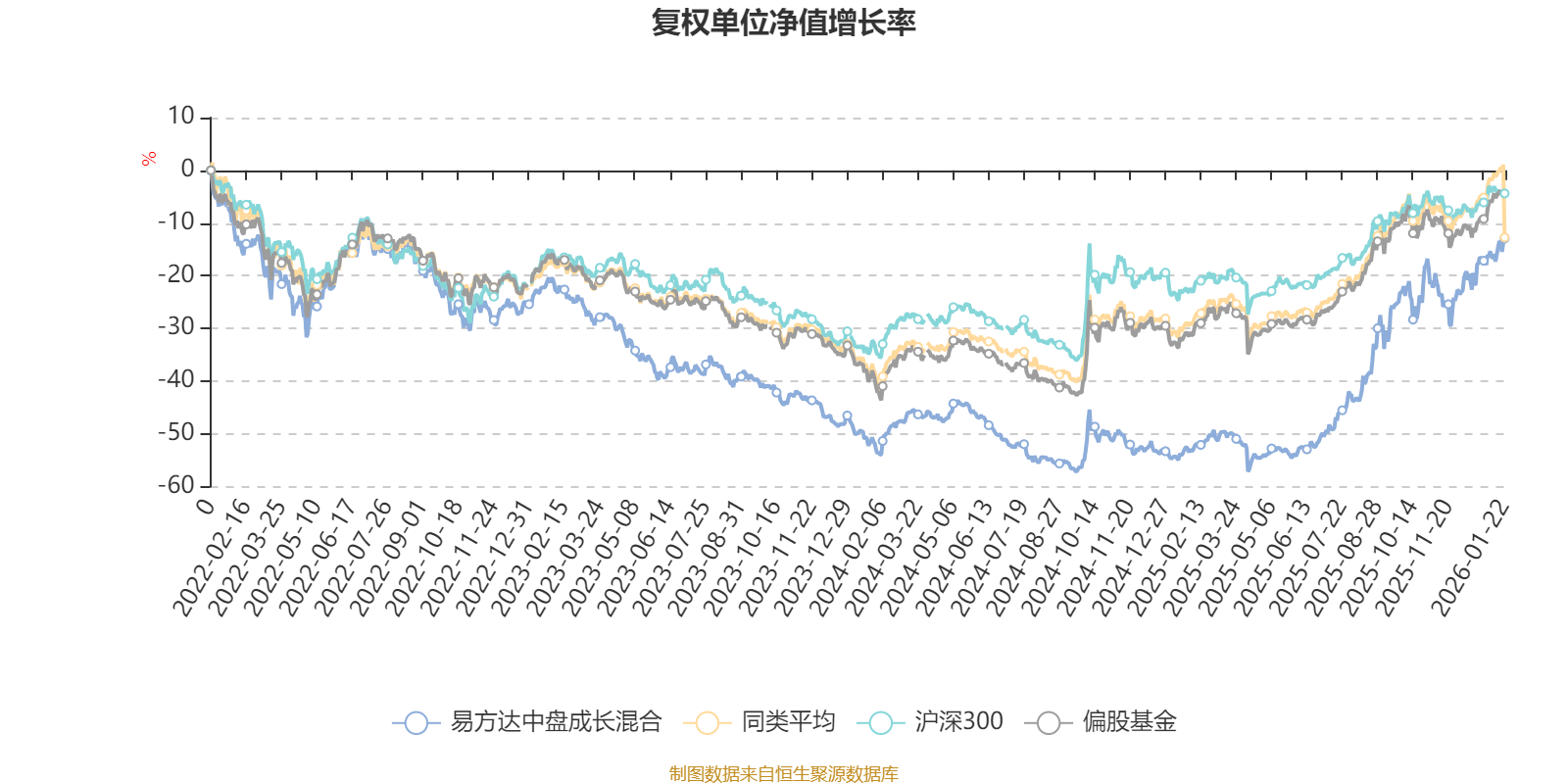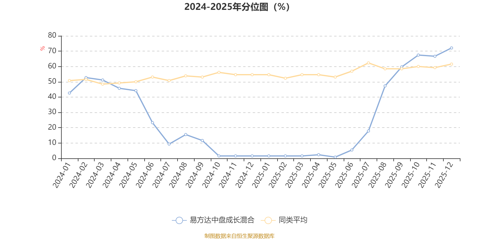 截至1月22日,易方达中盘成长混合近三个月复权单位净值增长率为15.07%,位于同类可比基金20/130;近半年复权单位净值增长率为59.80%,位于同类可比基金7/130;近一年复权单位净值增长率为84.73%,位于同类可比基金6/130;近三年复权单位净值增长率为10.16%,位于同类可比基金79/125。