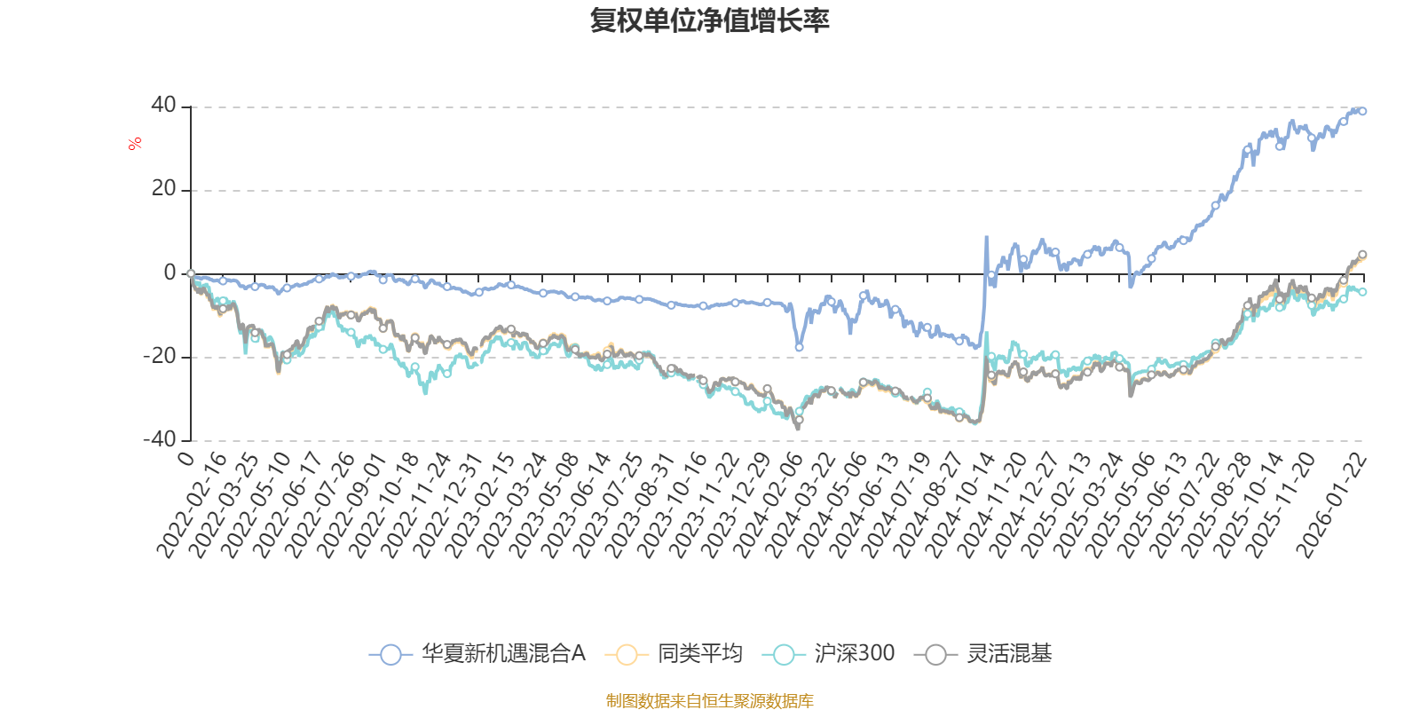 截至1月22日,华夏新机遇混合A近三个月复权单位净值增长率为4.83%,位于同类可比基金859/1286;近半年复权单位净值增长率为19.42%,位于同类可比基金697/1286;近一年复权单位净值增长率为34.43%,位于同类可比基金607/1286;近三年复权单位净值增长率为43.46%,位于同类可比基金232/1286。