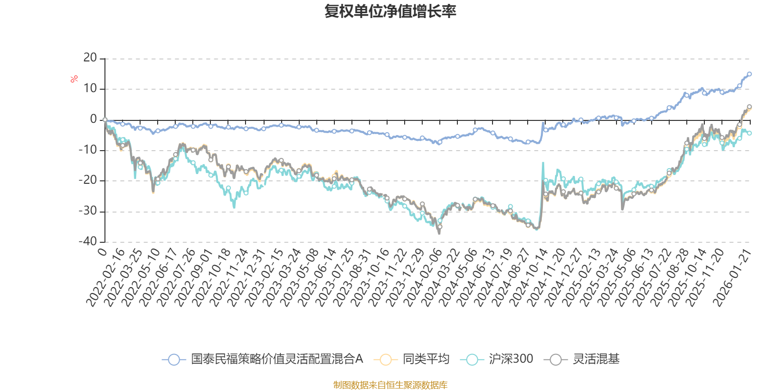 截至1月21日,国泰民福策略价值灵活配置混合A近三个月复权单位净值增长率为5.77%,位于同类可比基金774/1286;近半年复权单位净值增长率为10.90%,位于同类可比基金927/1286;近一年复权单位净值增长率为15.04%,位于同类可比基金1008/1286;近三年复权单位净值增长率为17.21%,位于同类可比基金606/1286。