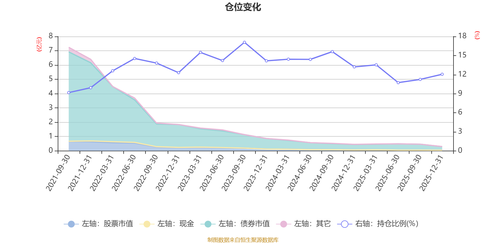 据定期报告数据统计,近三年平均股票仓位为13.84%,同类平均为19.2%。2023年三季度末基金达到17.08%的最高仓位,2021年三季度末最低,为9.16%。